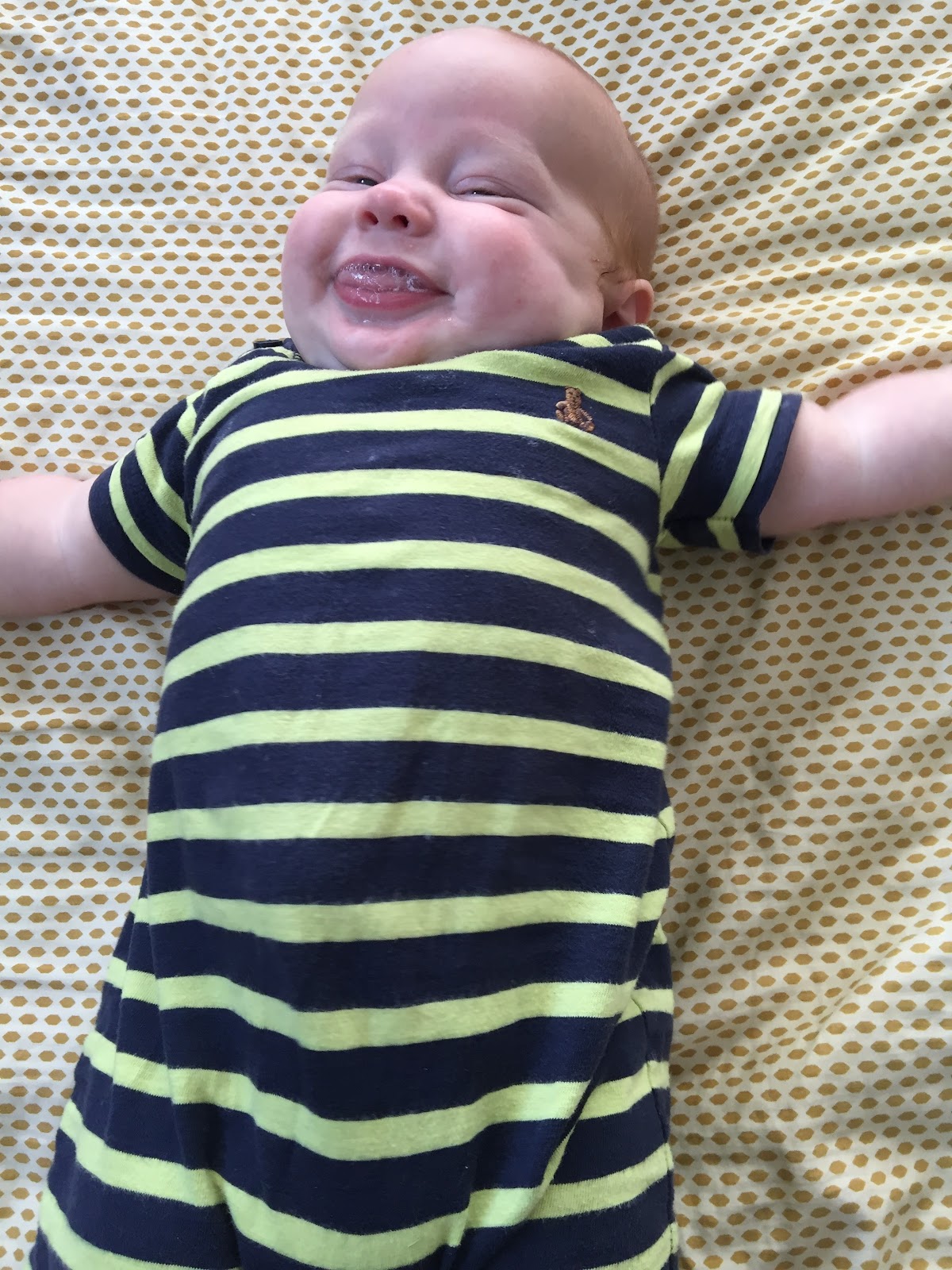 This guy is a spitter. Like yuck most of the time. He is getting chubbier by the day. He is a super fast nurser. All my babes really are. He loves to roll over. Both directions. Still a great sleeper. Mostly through the night. Still so crazy because NONE of my babies have ever done that. Naps in his crib if we are home! And a great napper too! He is really a great baby! Still kind goes a long time between poops though! Usually once a week! Crazy I know! But well there could be worse things, right?